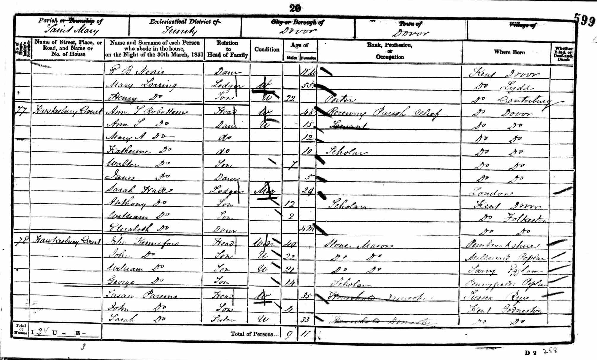 Dwelling: Hawkesbury Court Census Place: Dover, Kent, England PRO Ref: HO107 / 1632 / 599 / 20 and 21
