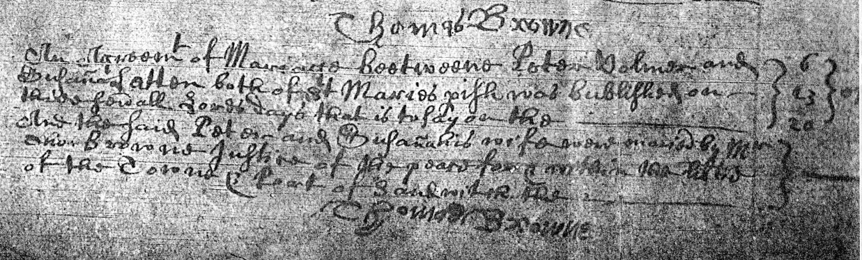 An agreement of marriage betweene Peter Holmes and Susana (?)at(?)en both of St Maries parish was published on three general Lords days that is to say the 6, 13, 20 of May 1655. And the said Peter & Susana his wife were married by me Thomas Browne Justice of the peace for and within the libertie of the towne and port of Sandwich the 2nd June 1655.