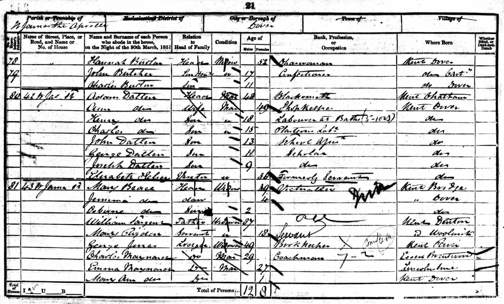 Dwelling: 42 St James Street Census Place: Dover, Kent, England PRO Ref: HO107 / 1632 / 242 / 21