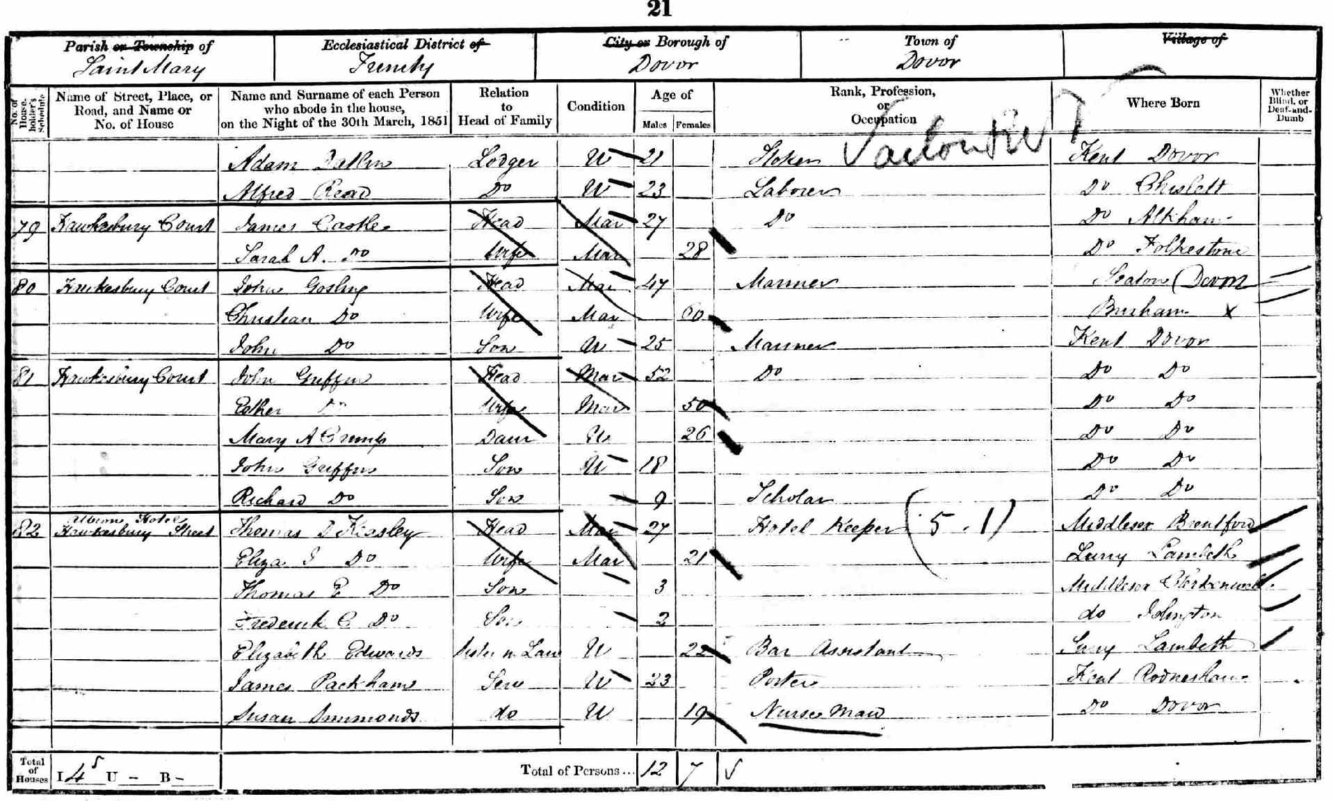 Dwelling: Hawkesbury Court Census Place: Dover, Kent, England PRO Ref: HO107 / 1632 / 599 / 20 and 21
