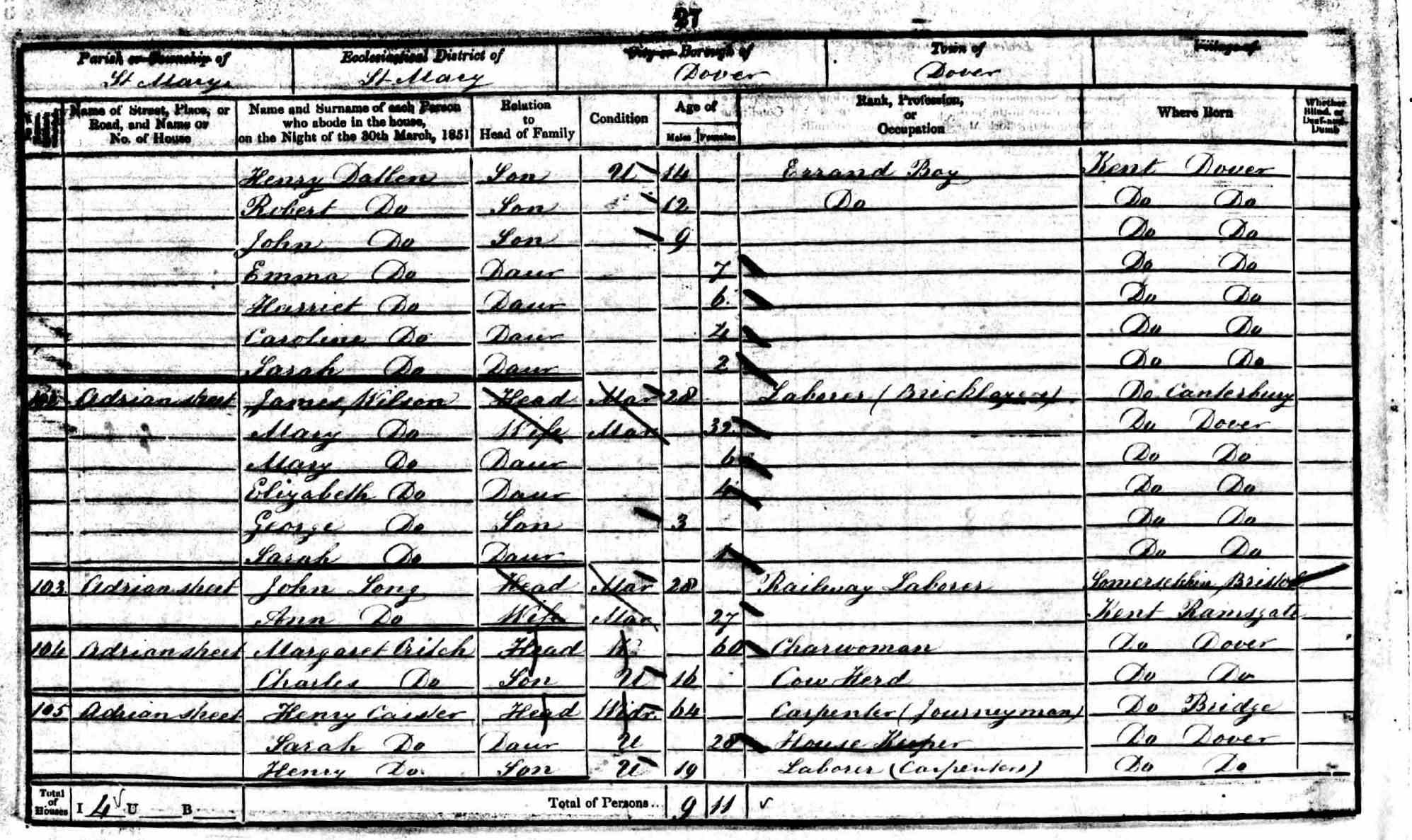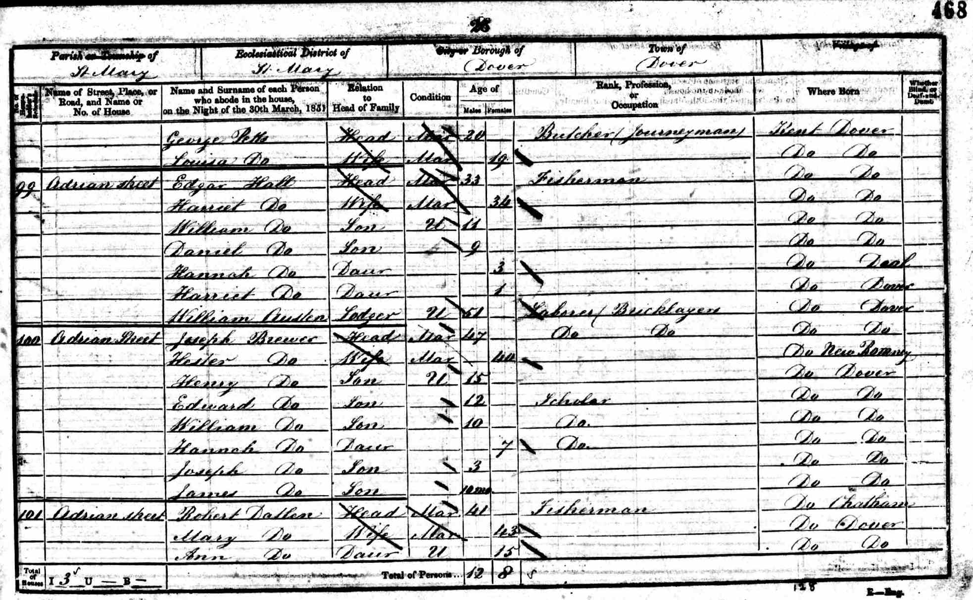 Dwelling: Adrian Street Census Place: Dover, Kent, England PRO Ref: HO107 / 1632 / 468 / 26 and 27