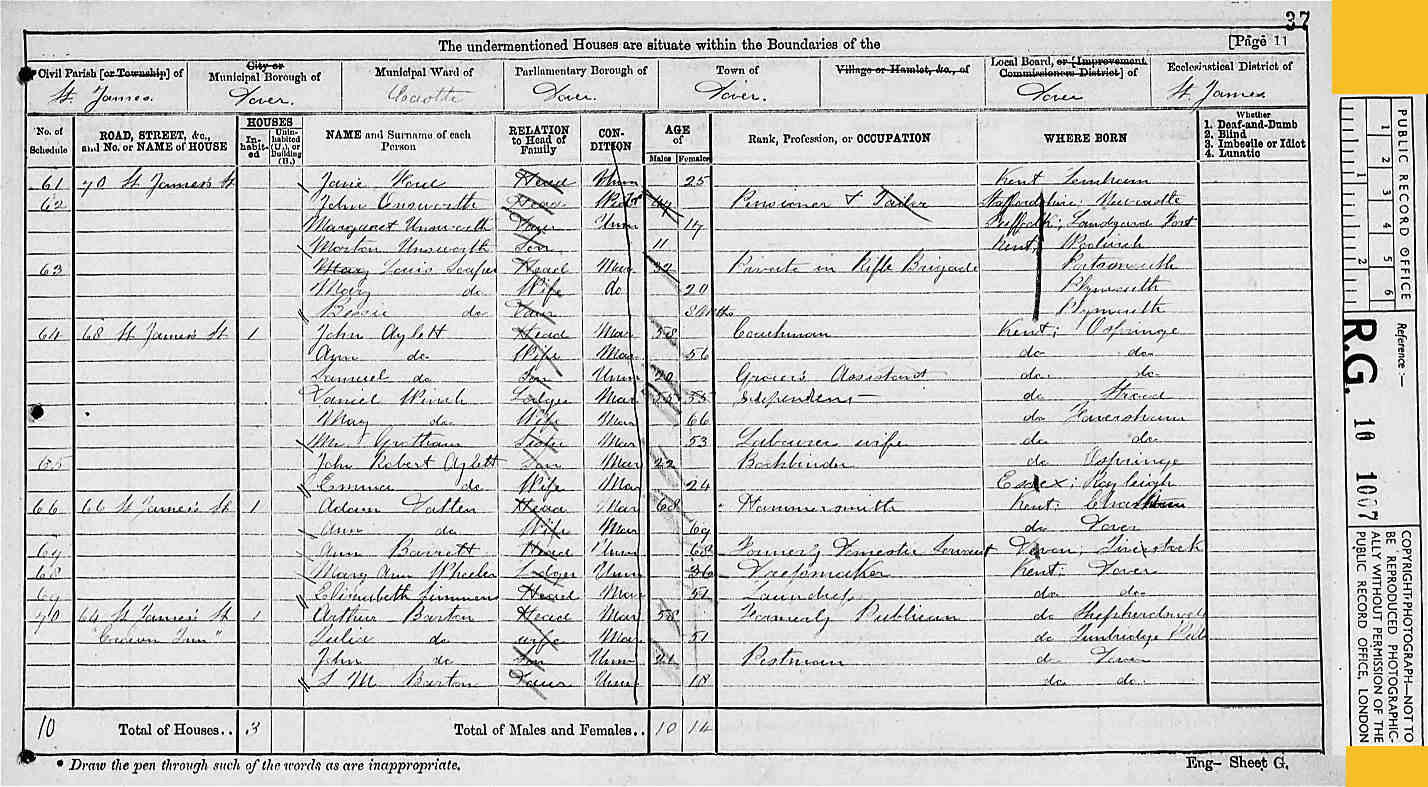 Dwelling: 66 St James Street Census Place: Dover, Kent, England PRO Ref: RG10 Piece 1007 Folio 37 Page 11