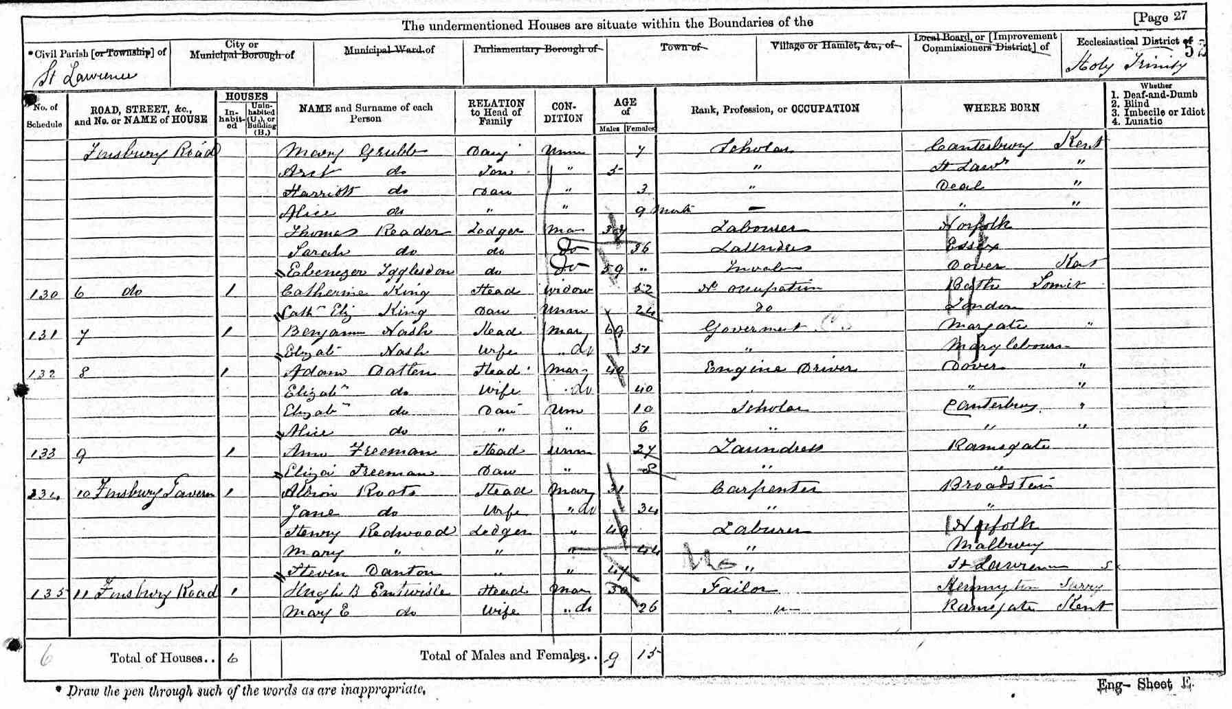 Dwelling: 8 Finsbury Road Census Place: St Lawrence, Kent, England PRO Ref: RG10 Piece 997 Folio52 Page 27