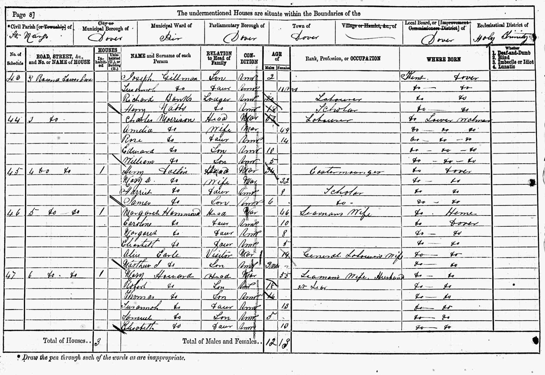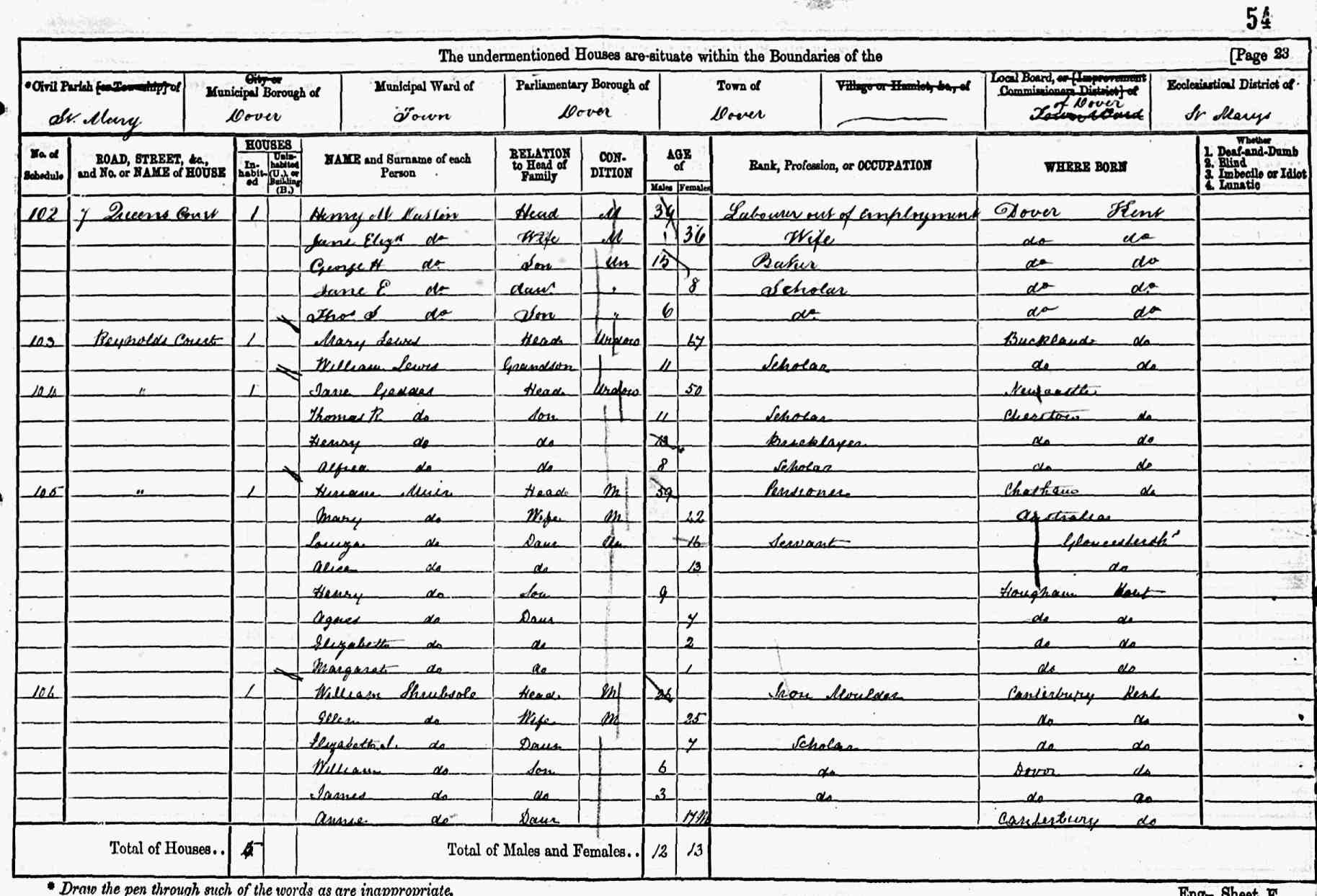 Dwelling: 7 Queens Court Census Place: Dover, Kent, England PRO Ref: RG10 Piece 1009 Folio 54 Page 23