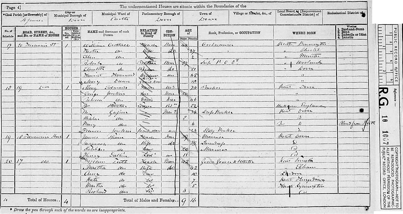 Dwelling: 18 Trevanion Street Census Place: Dover, Kent, England PRO Ref: RG10 Piece 1007 Folio 89 Page 4