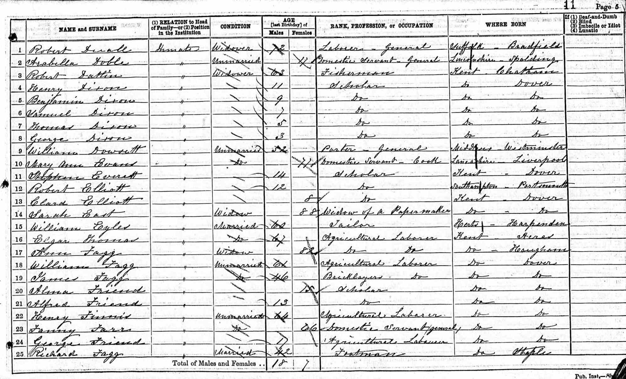 Dwelling: The Union Workhouse Census Place: Dover, Kent, England PRO Ref: RG10 Piece 1013 Folio 11 Page 5