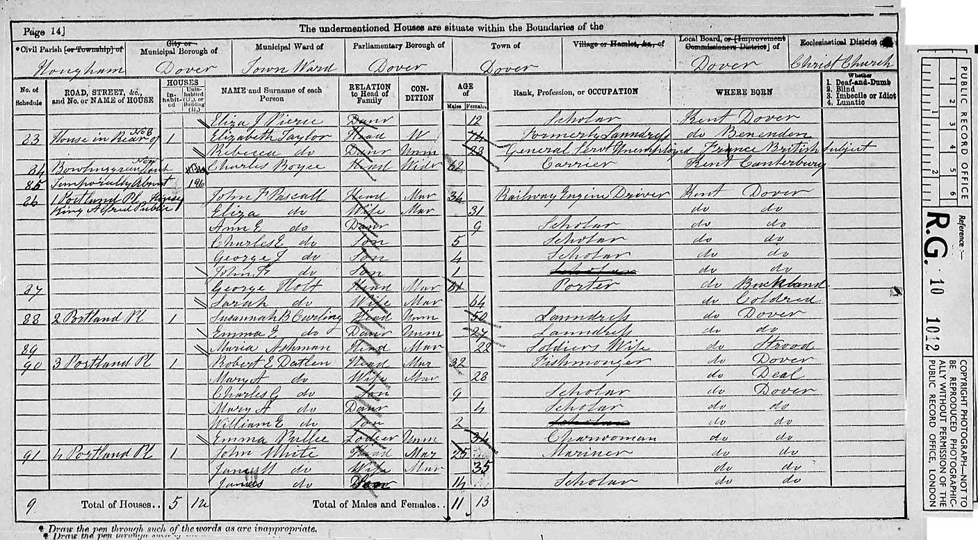 Dwelling: 3 Portland Place Census Place: Dover, Kent, England PRO Ref: RG10 Piece 1012 Folio 66 Page 14