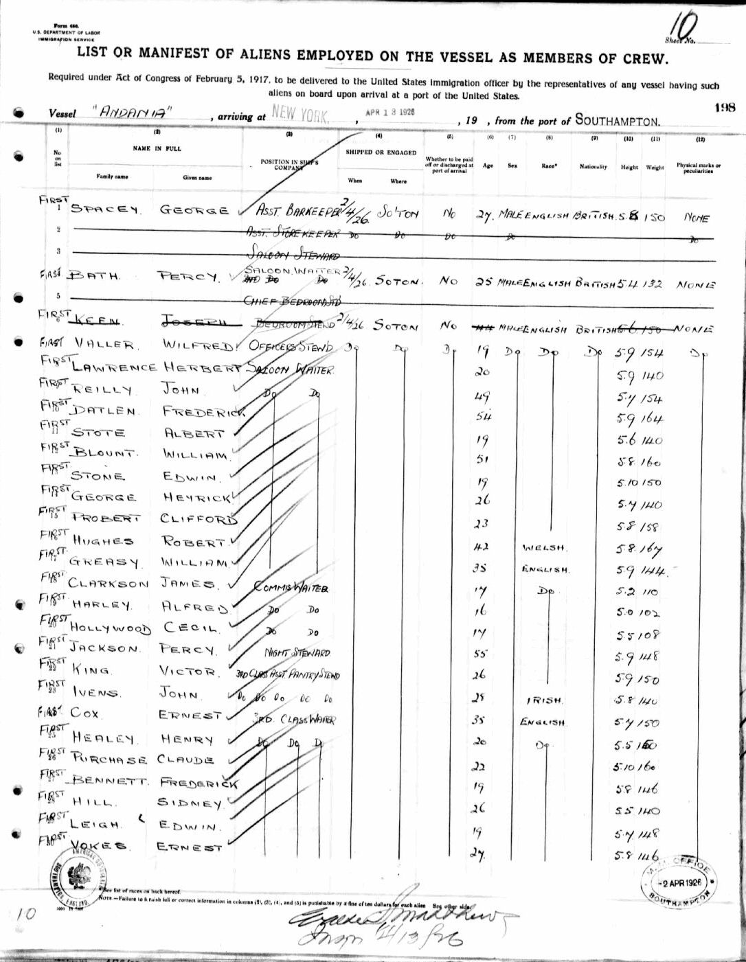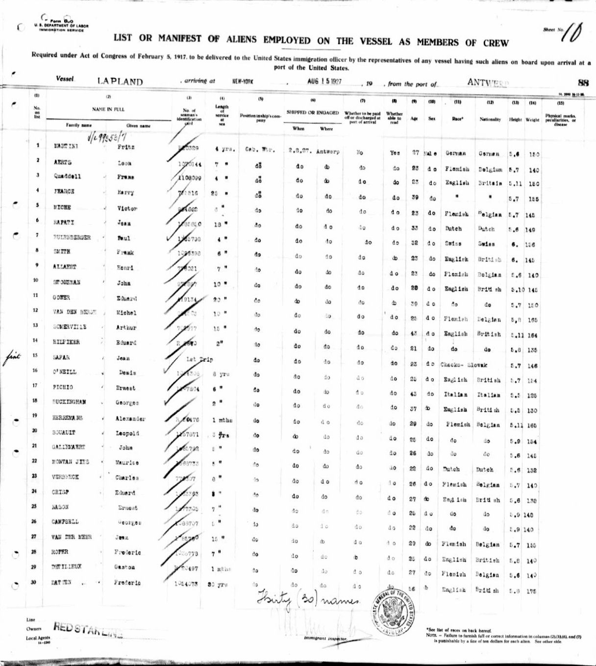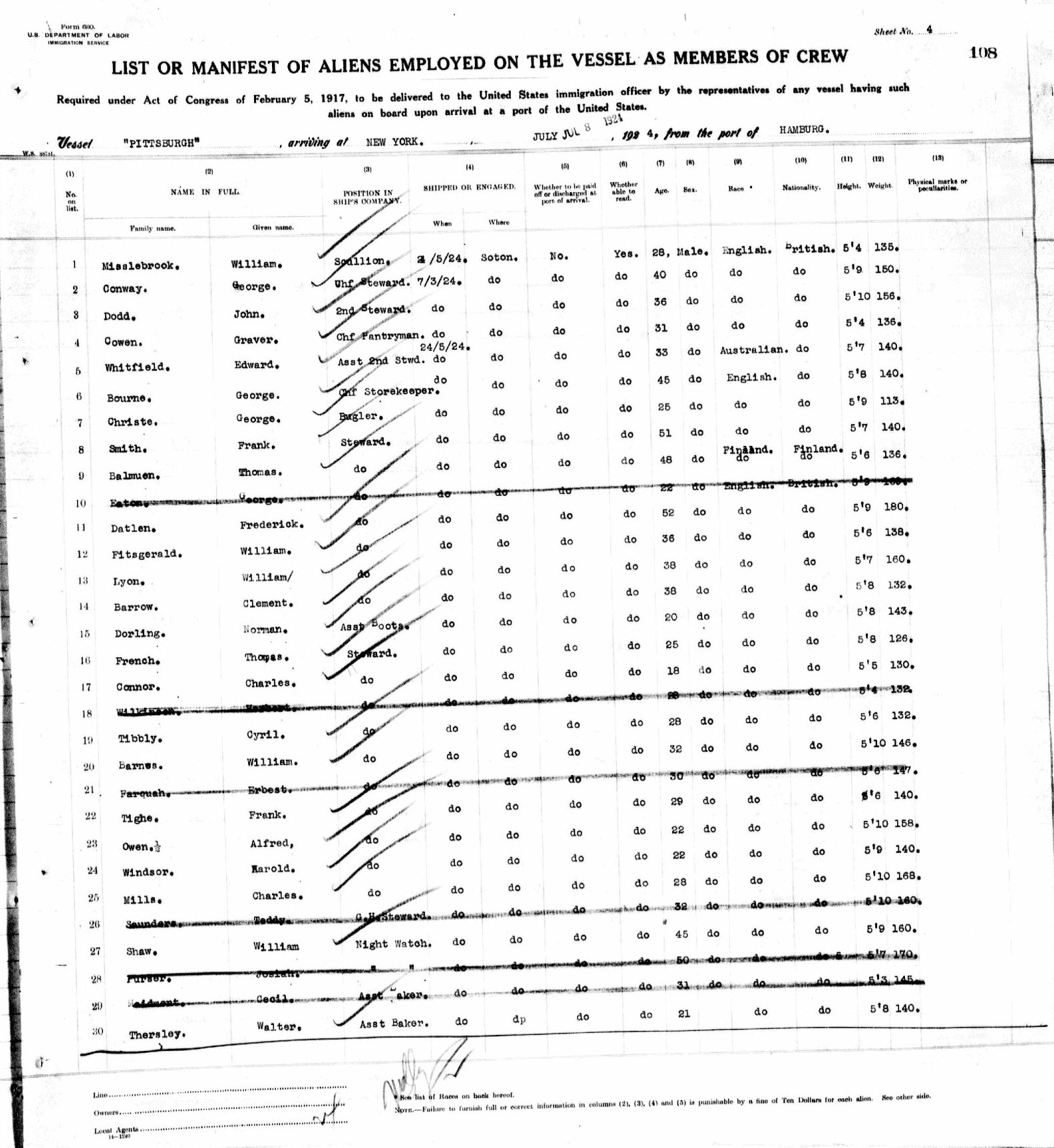 Employment record for Frederick Datlen (son of Robert / Robert / Johannes) born 1871 Arrivals into New York, USA